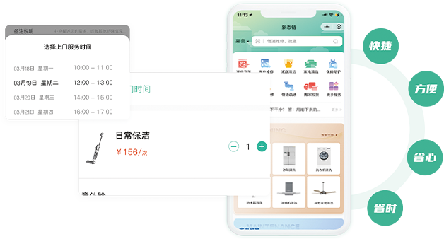根据用户需求,预约服务人员上门服务。一键支付